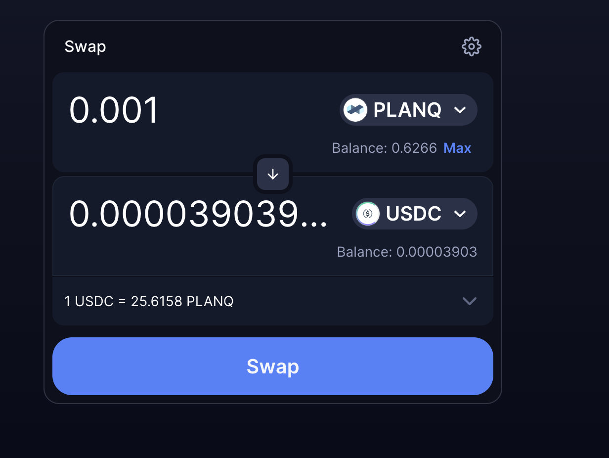 * For this example, let's say you want to swap **Planq** for USDC. Select **Planq** in the "From" dropdown and USDC on any token in list in the "To" dropdown.