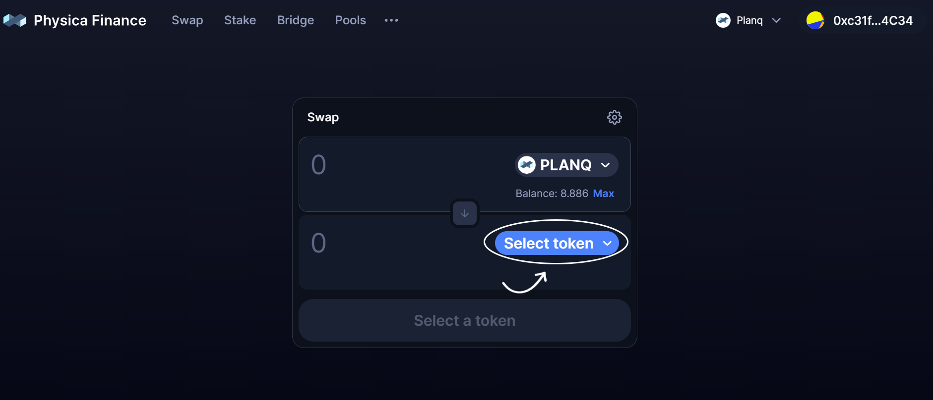 * Once your wallet is connected, you'll see options to select the tokens you want to swap. In Physica Finance, you can swap any token for another, as long as there's liquidity for both tokens.